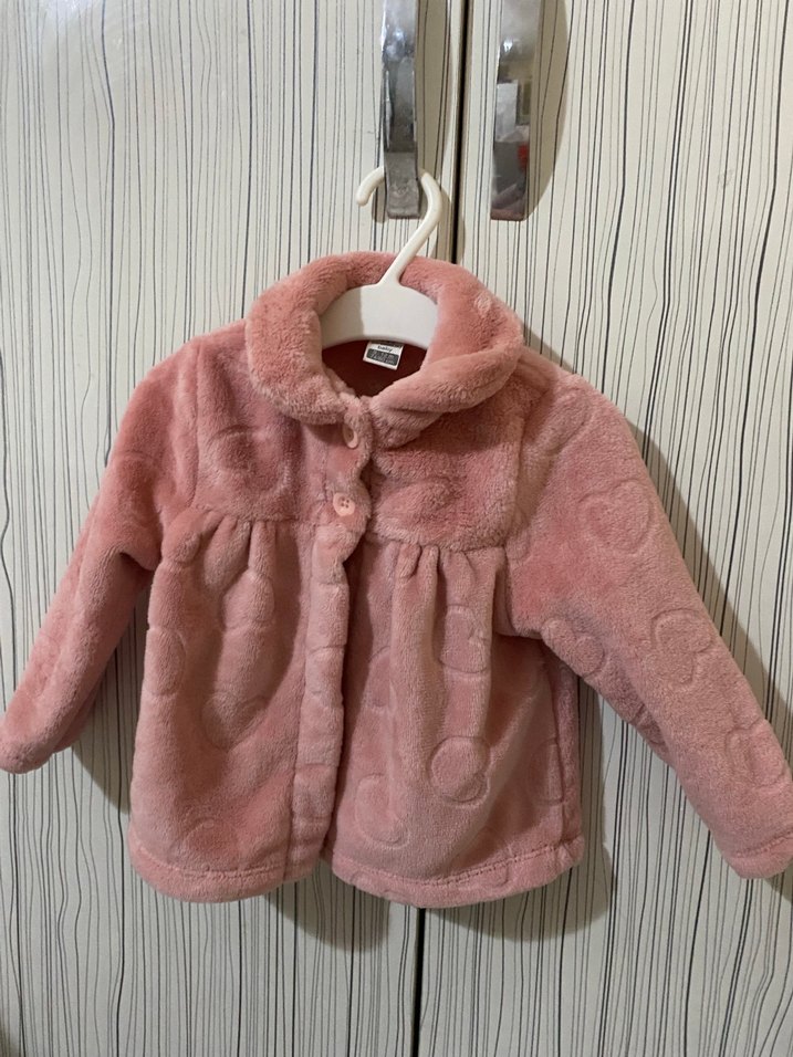 Pembe renkli, tüylü detaylı, yumuşak ve sıcak kumaşlı kız çocuk ceketi. Notched lapel yakalı, bol kesim ve düz pastel tasarımlı.