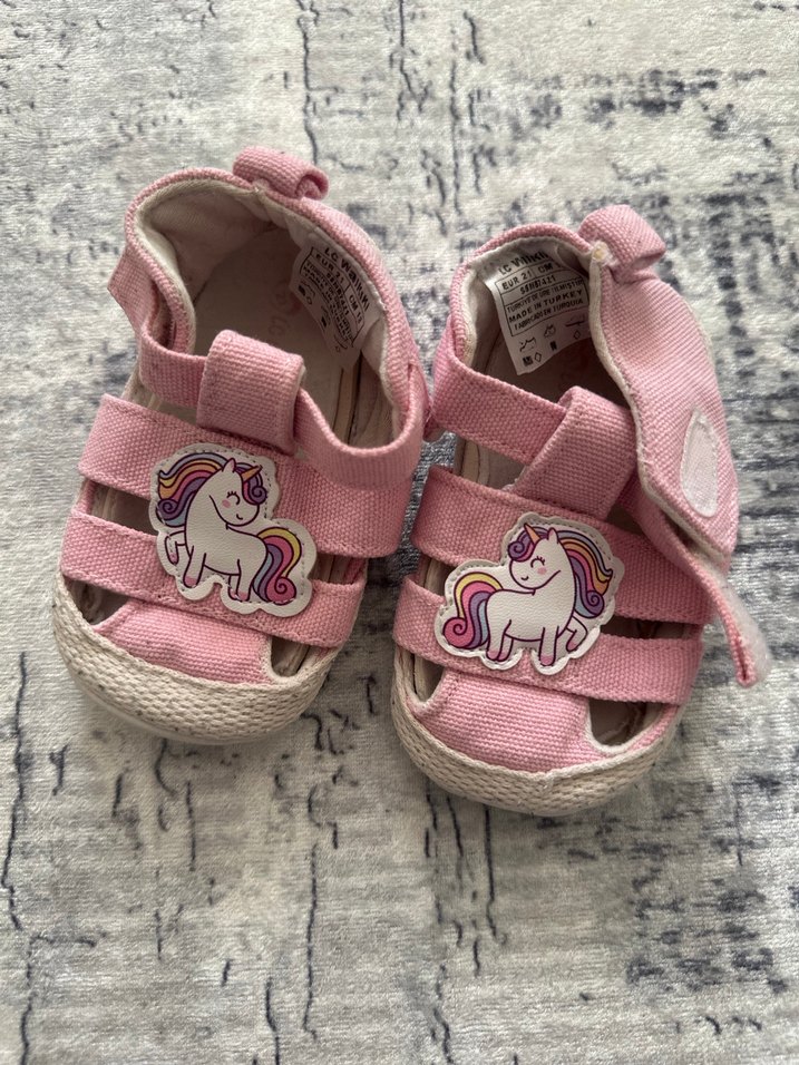 Pembe pastel tonlu kauçuk sandaletler, baskılı unicorn desenli ve cırt cırtlı kapanışa sahiptir. Trendy günlük sokak giyimi için uygundur.