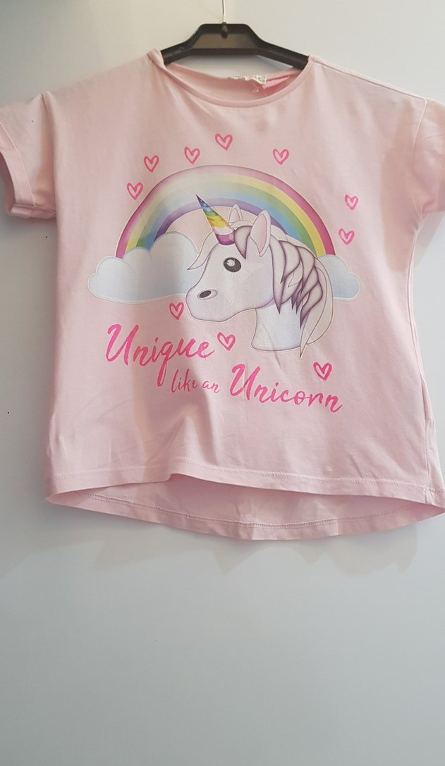 Pamuk kumaştan yapılmış, kısa kollu ve bol kesim pembe kız çocuk tişörtü. Üzerinde gökkuşağı ve kalplerle süslenmiş unicorn baskısı bulunur. Renkleri ilk güne göre biraz solmuş, baskısı hafif deforme olmuştur ancak gayet iyi durumdadır.