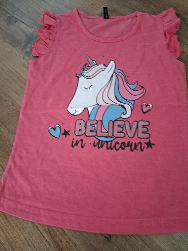 9.10 yaş yurtdışı ürünü unicorn pembe pamuklu, bol kesim kız çocuk tişörtü, unicorn baskılı ve fırfırlı kısa kollu, yuvarlak yakalı. Pastel pop kültür tarzında.