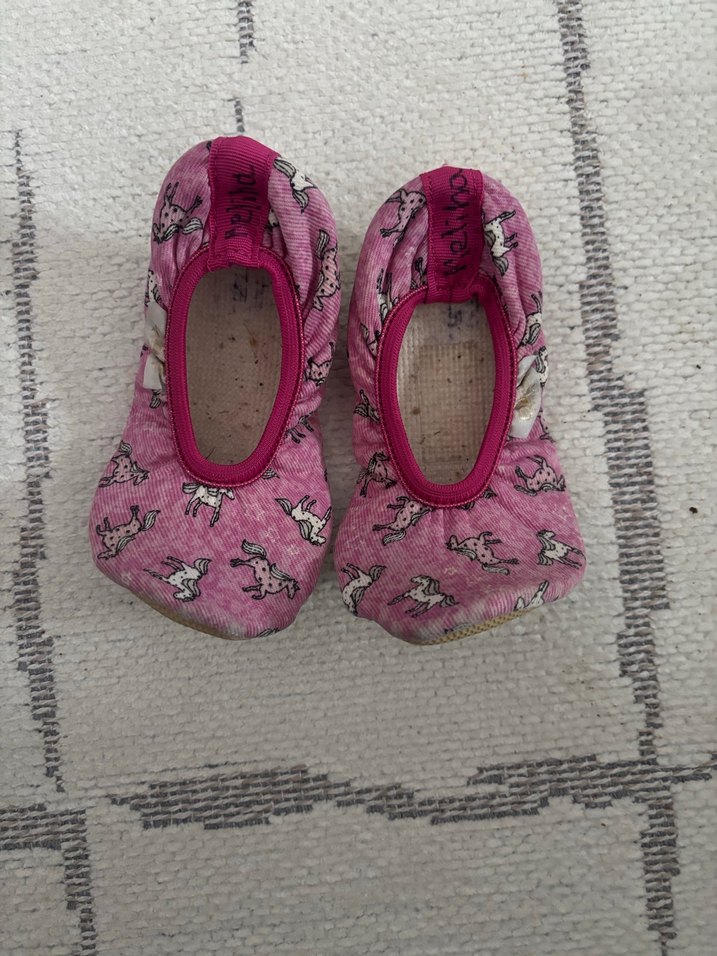 Pembe tüylü kumaştan yapılmış, renkli unicorn desenli ve cırt cırt bantlı kız çocuk havuz patiği. Rahat ve eğlenceli tasarım.