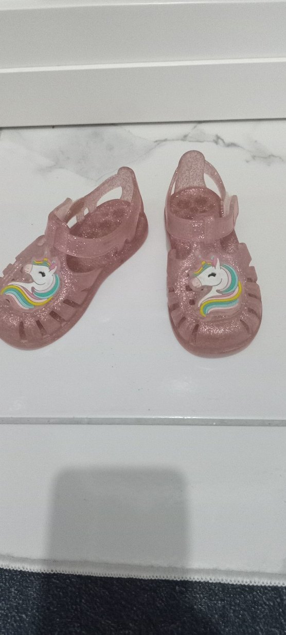 Pembe plastik malzemeden yapılmış, tokalı ve renkli unicorn desenli kız çocuk sandaletleri, günlük sokak giyimine uygun.