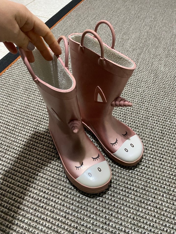 Next Pembe kauçuk kız çocuk yağmur çizmesi, kapalı göz ve küçük boynuzlu unicorn tasarımlı. Yanlarda tutma kolları ile kolay giyilir. Rahat ve şık.