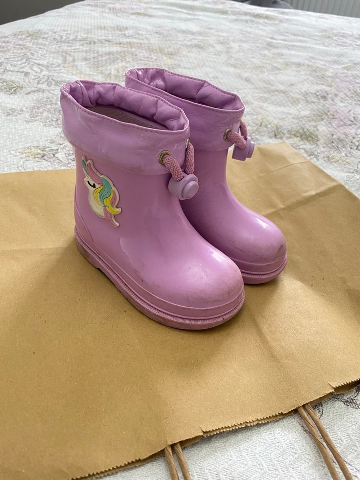 Pembe pastel renkte, unicorn desenli kauçuk kız çocuk yağmur çizmesi. Cırt cırtlı kapanışı ve tie-dye tarzıyla günlük rahat kullanıma uygundur.