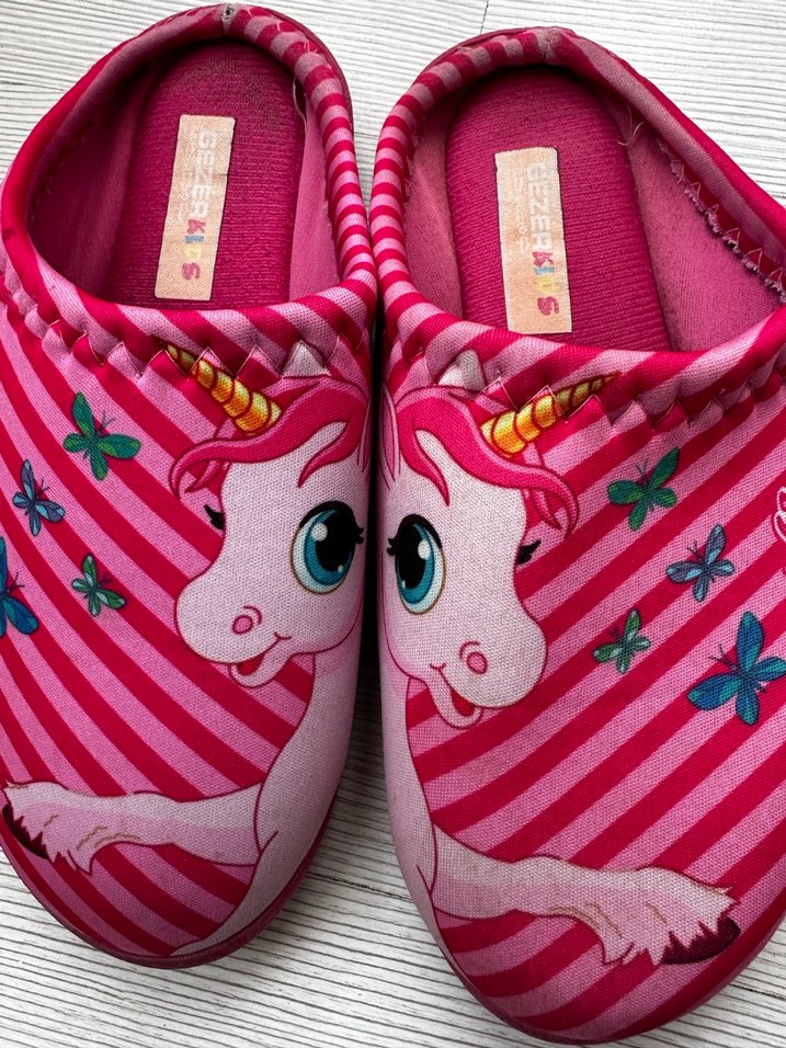 Pembe renkli, yumuşak sentetik kumaştan yapılmış, renkli unicorn baskılı kız çocuk terlikleri. Kolay giyilebilmesi için cırt cırtlı bantlıdır.
