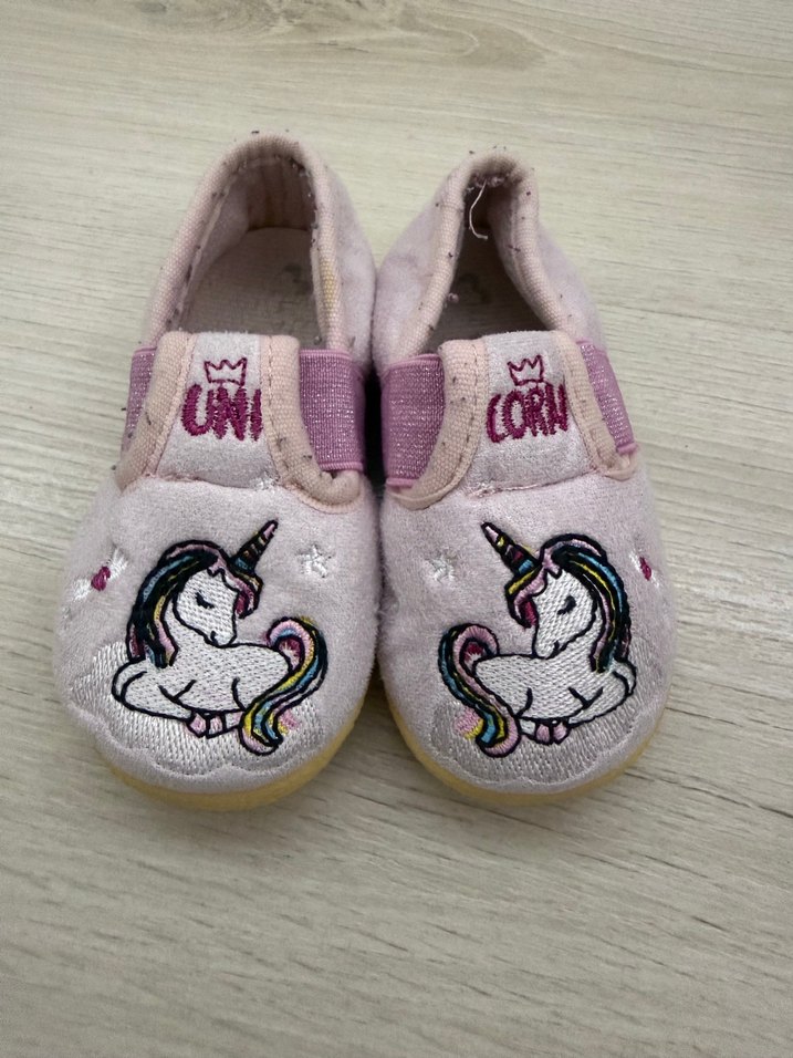 Pembe polar kumaştan yapılmış, unicorn nakışlı ve cırt cırtlı kız çocuk ev terliği. 21 numara LCW markadır.