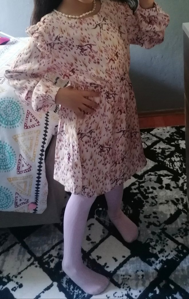 Pembe pastel tonlarında bağlamalı desenli, uzun kollu, yüksek yakalı ve bol kesim kız çocuk elbisesi, sokak modasına uygun.