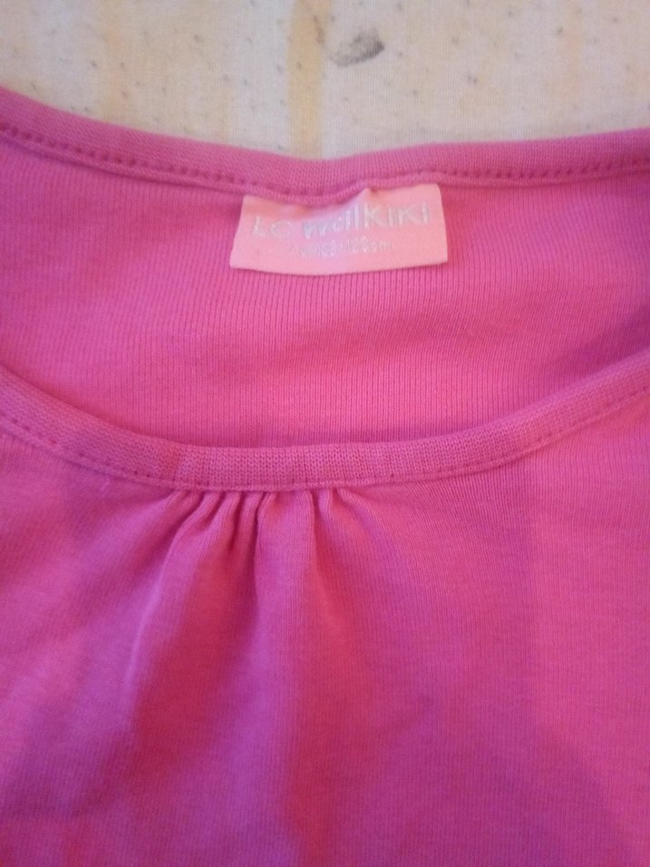Pembe pastel renkte, yuvarlak yakalı ve kısa kollu kız çocuk tişörtü. İpeksi dokuda ve düğmeli, bol kesim basic model.