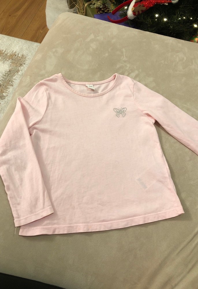 Pembe renkli, uzun kollu kız çocuk tişörtü, rahat kesim ve yumuşak, sıcak kumaşa sahip. Küçük kelebek baskısı bulunur. Temizdir lekesizdir