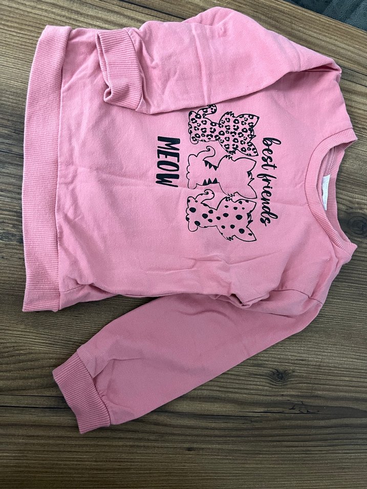 Pembe renkte, uzun kollu ve yuvarlak yaka kız çocuk sweatshirtü. Yumuşak kumaştan olup, üzerinde 'MEOW' ve 'bestfriends' yazılı baskılar ve sevimli hayvan figürleri bulunur. Rahat kalıplı ve günlük stil için uygundur. 2/3 yaş uygundur temiz