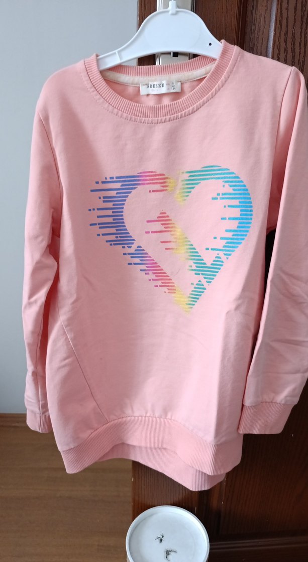 Pembe renkli kız çocuk sweatshirtü, uzun kollu ve yuvarlak yakalıdır. Rahat kesimi ve renkli baskılı kalp deseni vardır. Yumuşak sentetik kumaştan üretilmiştir.