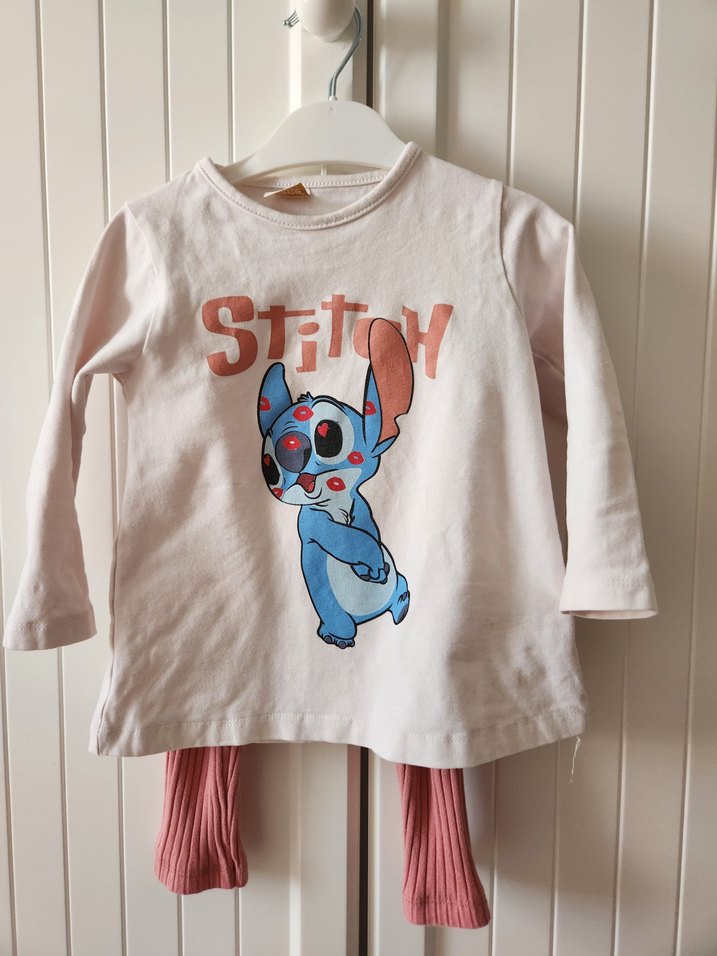 Pastel pembe renkte, uzun kollu kız çocuk tişörtü, rahat kesim ve yumuşak pamuklu kumaş üzerinde baskılı Stitch figürü ile. 2 kere giyildi temizdir