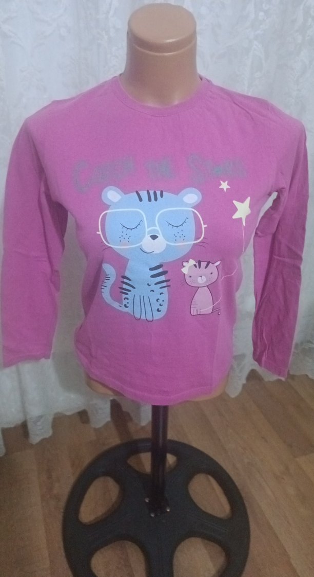 Pembe renk, uzun kollu kız çocuk tişörtü, rahat kesim ve yuvarlak yakaya sahiptir. Yumuşak, pamuklu kumaştan yapılmış olup kedi ve fare baskısı bulunur.
