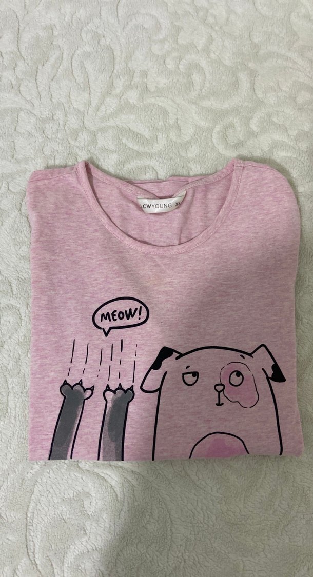 Pamuklu, örme kumaştan yapılmış, uzun kollu ve yuvarlak yakalı pembe tişört. Üzerinde köpek ve 'MORNING MOOD' yazılı baskı bulunur. Koltukaltında terden kaynaklı hafif sararma var