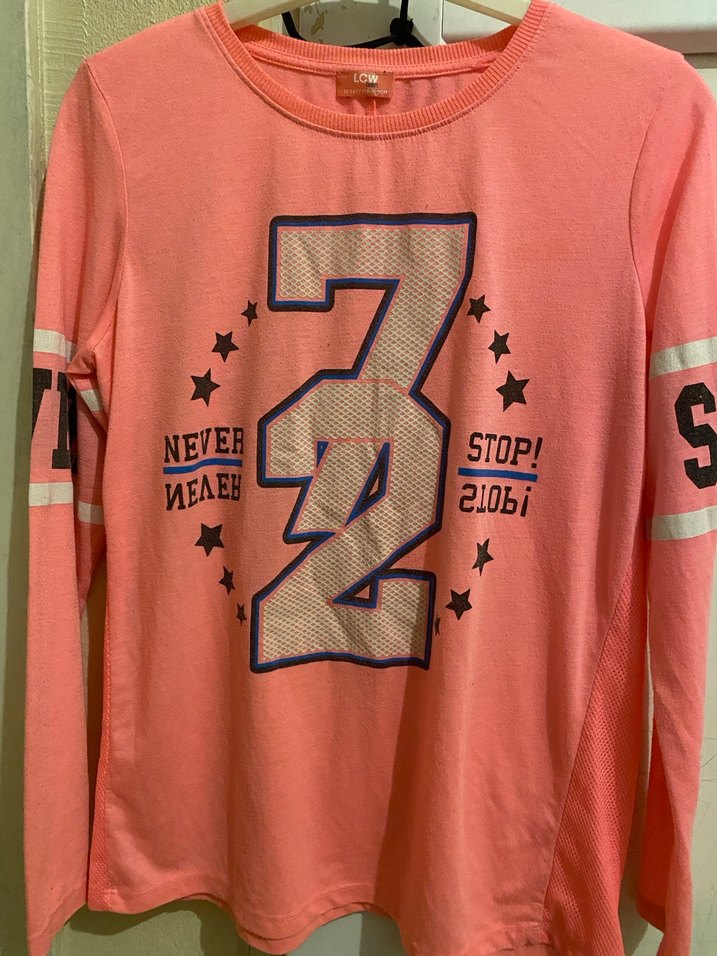 Bu pastel pembe uzun kollu tişört, bol kesim ve yuvarlak yaka ile dikkat çeker. Örgü dokusu ve baskılı grafikler üzerinde STOP! ve NEVER yazıları bulunur. Yumuşak ve rahat kumaş konfor sağlar.