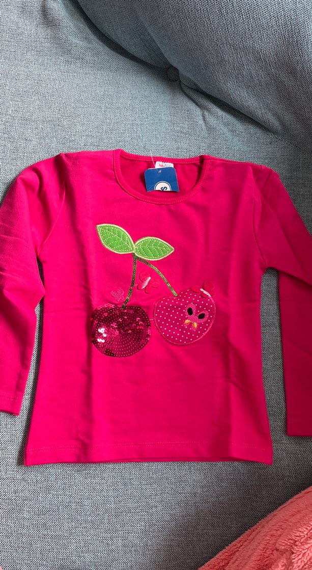 Pembe renkli, uzun kollu ve dar kesim kız çocuk tişörtü, yumuşak ve sıcak kumaştan, pul işlemeli ve düğmeli renkli kiraz baskılıdır.