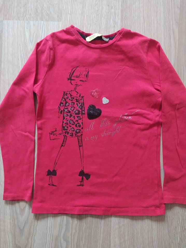 Pembe renkli, uzun kollu, bol kesim kız çocuk tişörtü. Yuvarlak yaka ve renkli baskılı desen detaylarına sahiptir.