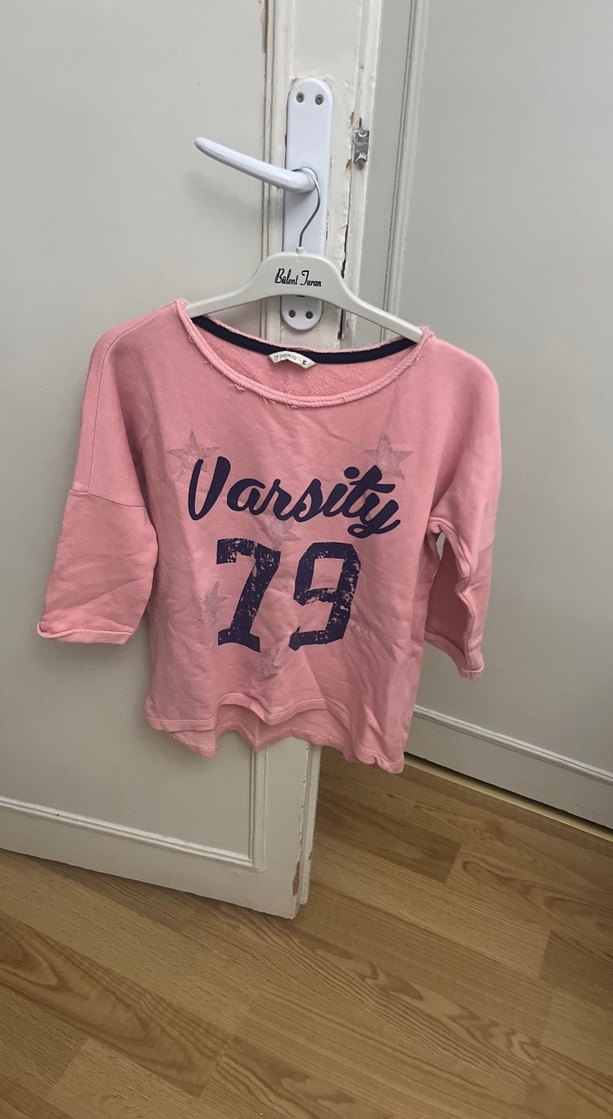 Pamuklu, pembe pastel renk, uzun kollu, bisiklet yaka, salaş kesim kız çocuk tişörtü. Örme dokulu ve baskılı "79 Varsite" yazılı.