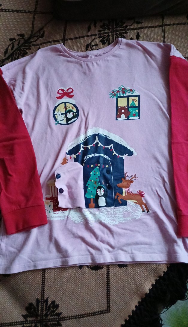 Pembe renk, uzun kollu, yuvarlak yakalı kız çocuk tişörtü. Örgü dokulu ve desenli baskıya sahip, rahat kesim ve yumuşak, sıcak kumaş.