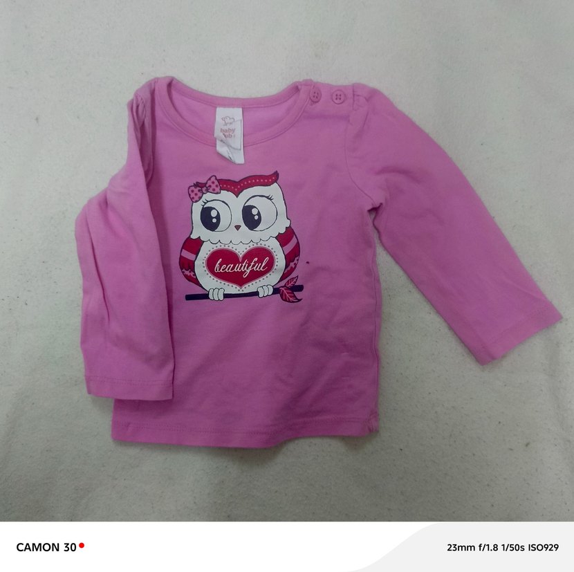 Pamuklu kumaştan yapılmış, uzun kollu, bisiklet yaka ve düğmeli omuzlu pembe tişört. Renkli baykuş baskısı ve "beautiful" yazısı bulunur.
