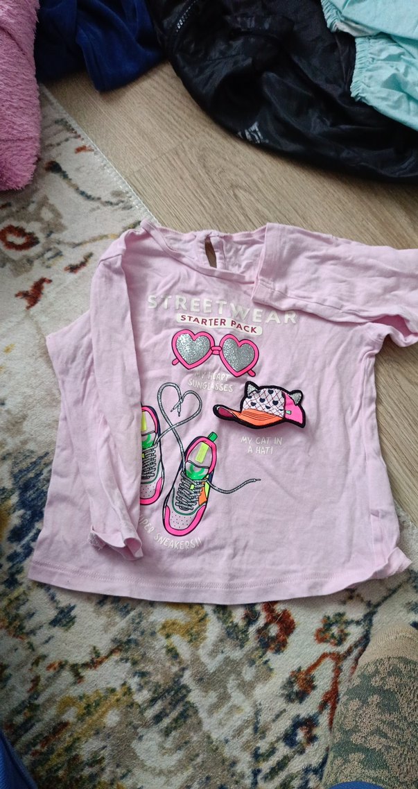 Pamuklu, bol kesim, uzun kollu kız çocuk tişörtü. Pastel pembe renk, baskılı streetwear desenli, yuvarlak yaka ve düğmeli detaylı.