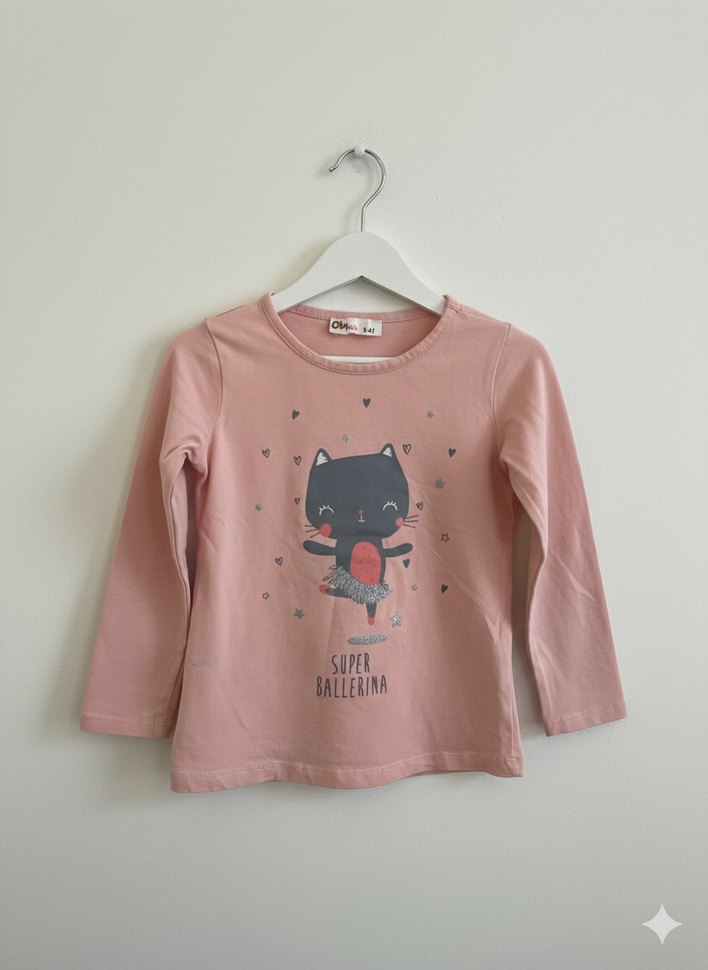 Pembe renkli, uzun kollu kız çocuk tişörtü, pamuklu örme kumaştan, bol kesim ve yuvarlak yaka. "SUPER BALLERINA" yazılı kedi baskısı bulunur.
