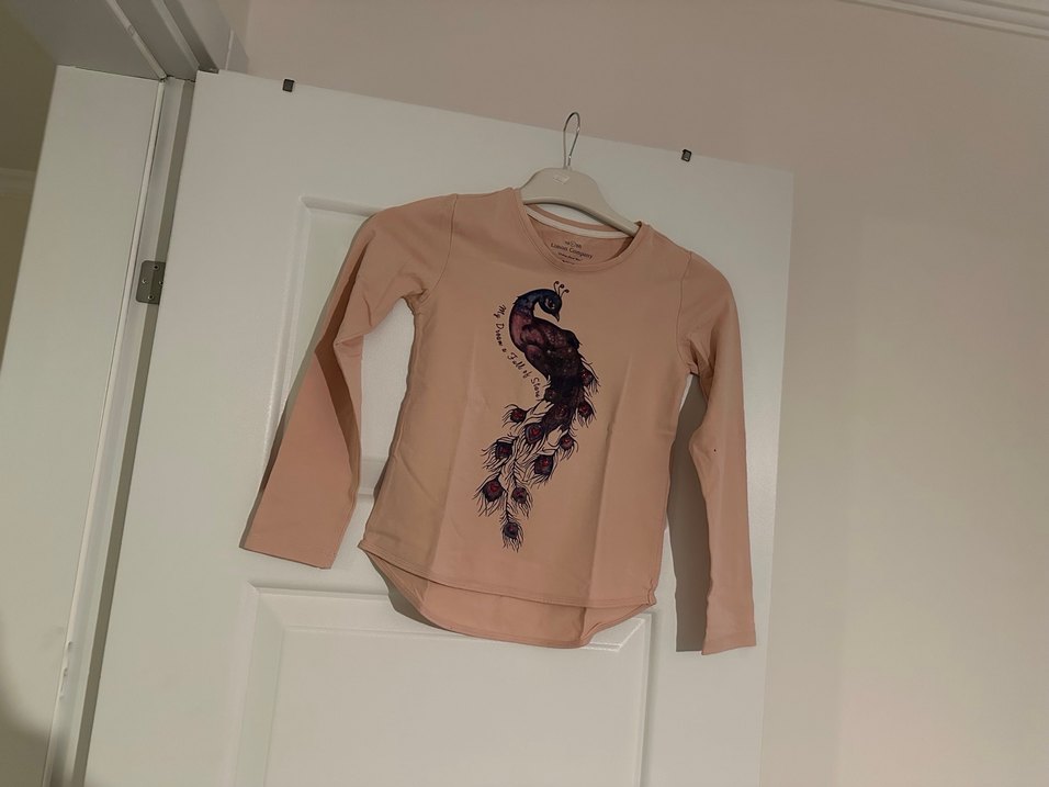 Pembe renkli, uzun kollu, dar kesim kız çocuk tişörtü. Önünde renkli tavus kuşu baskısı vardır ve yumuşak sentetik kumaştandır.