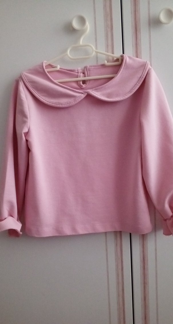 Pembe kız çocuk bluz, fırfırlı yuvarlak yaka ve uzun kolludur. Bol kesim ve yumuşak, sıcak kumaştan üretilmiştir. Düz, pastel renkte ve sade stilde.