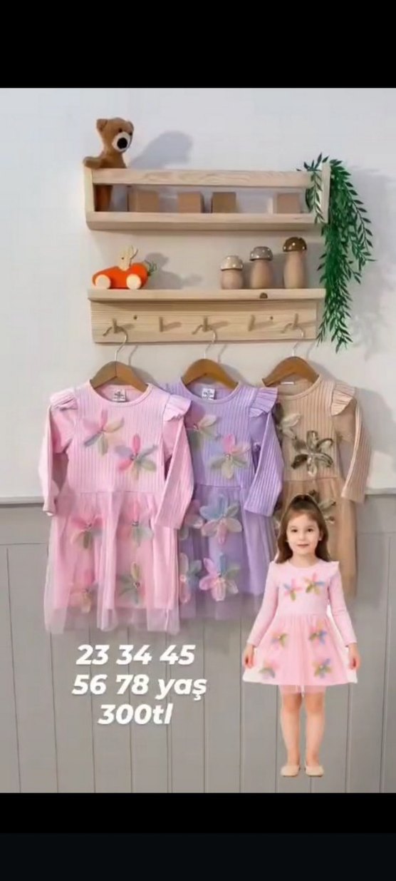 Pembe renkli kız çocuk elbisesi, uzun kollu, çiçek desenli ve fırfırlı detaylara sahip, rahat bir bol kesimdir.