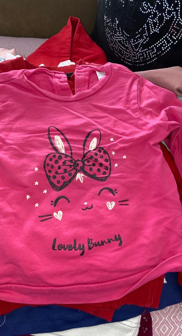 Pamuklu, pembe renkli, uzun kollu, dantel detaylı ve baskılı kız çocuk tişörtü. "Lovely Bunny" yazılı ve sevimli figürlü rahat kesim.