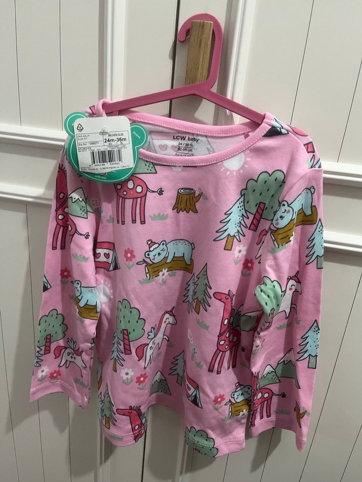 Pembe renkli, uzun kollu, bol kesim kız çocuk tişörtü. Yumuşak örme kumaştan, baskılı desenli, yuvarlak yakalı, sokak stili.