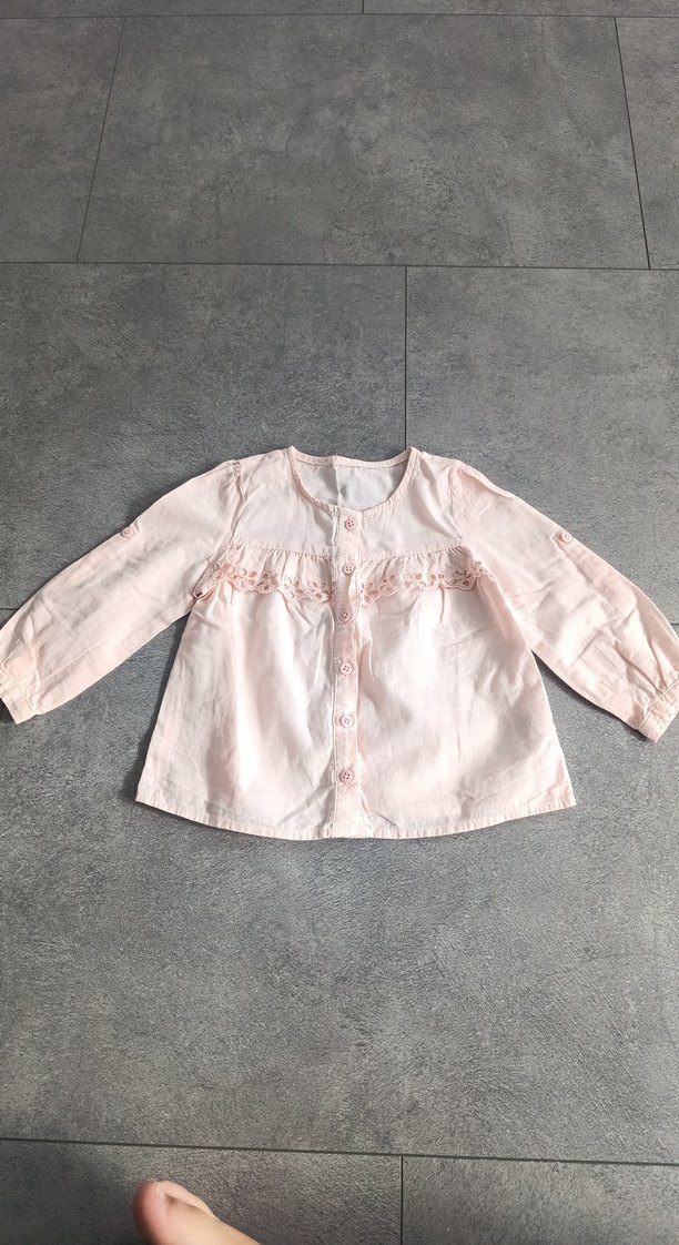 Pastel pembe renkte, uzun kollu, düğmeli ve yuvarlak yakalı kız çocuk gömleği. Yumuşak keten kumaştan, bol kesim ve nakış detaylıdır.
