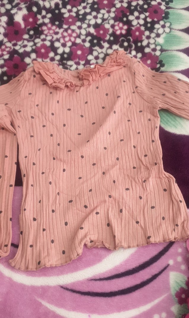 Pembe, uzun kollu, fırfırlı yakalı ve ince dokulu kız çocuk bluzu, rahat ve şık sokak stili için uygundur. Hafif benekli ve pastel renklidir.
