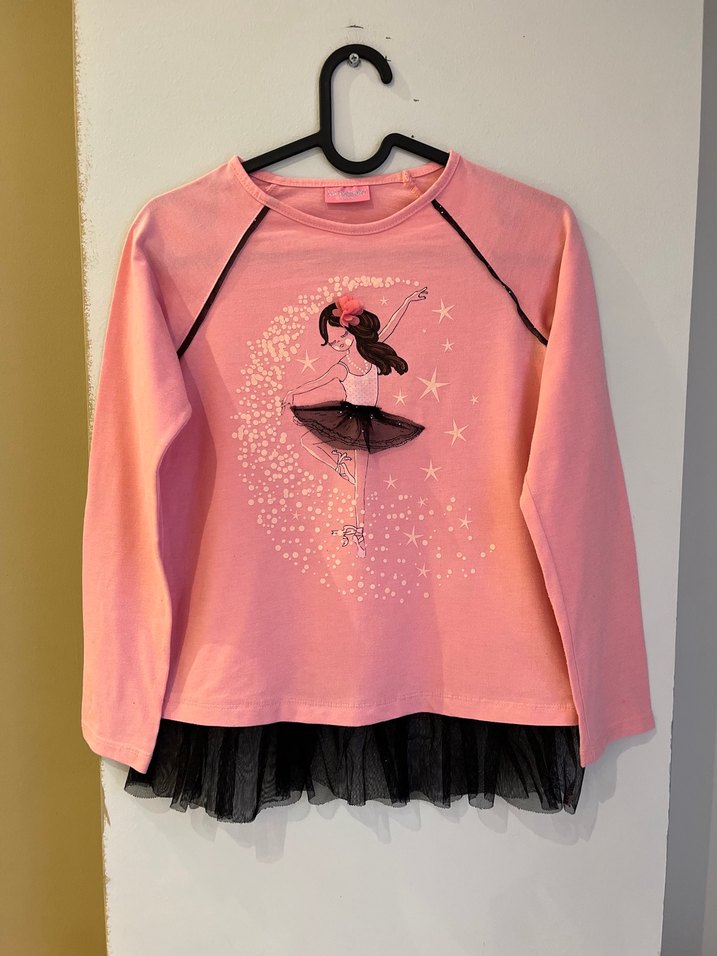 Kız çocuk pembe uzun kollu tişört, rahat kesim, baskılı bale teması ve siyah tül fırfır detayına sahip, yumuşak ve sıcak kumaştan üretilmiştir. 10-11 yaş bedendir.