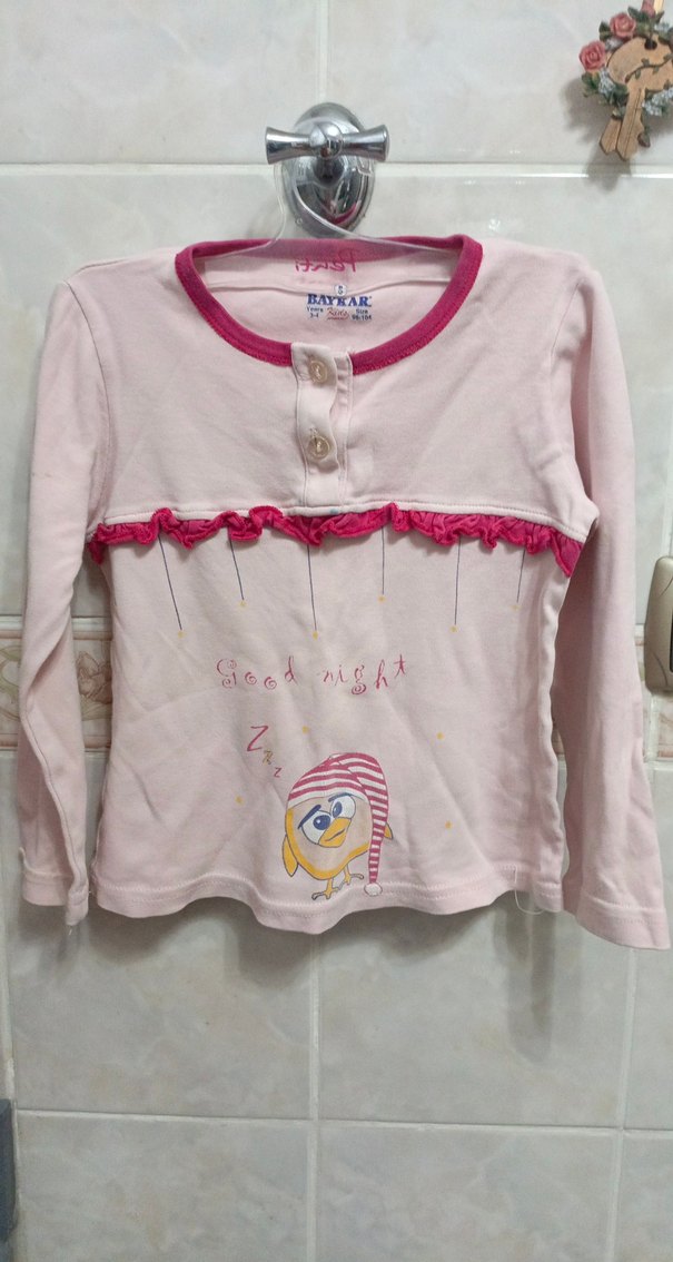 Pembe uzun kollu, yumuşak kumaştan yapılmış kız çocuk tişörtü; fırfır detaylı, bisiklet yaka ve renkli baskılı desenlidir. Rahat ve şık kesim.