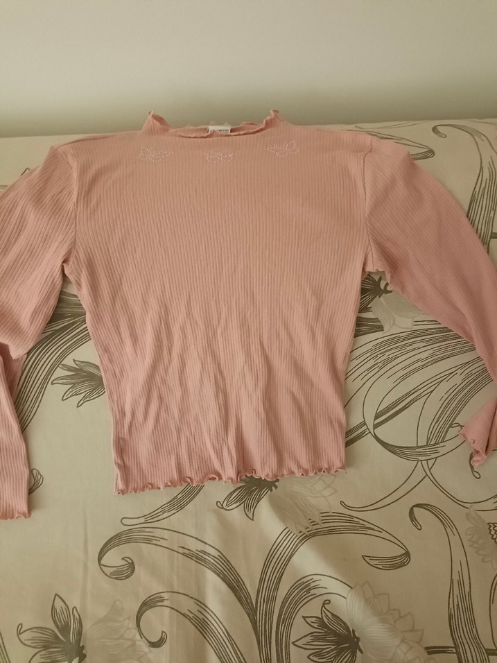 Pembe uzun kollu, fitted kesim kız çocuk tişörtü. Yumuşak keten kumaştan, yuvarlak yaka ve pastel renkte, desensiz tasarım.