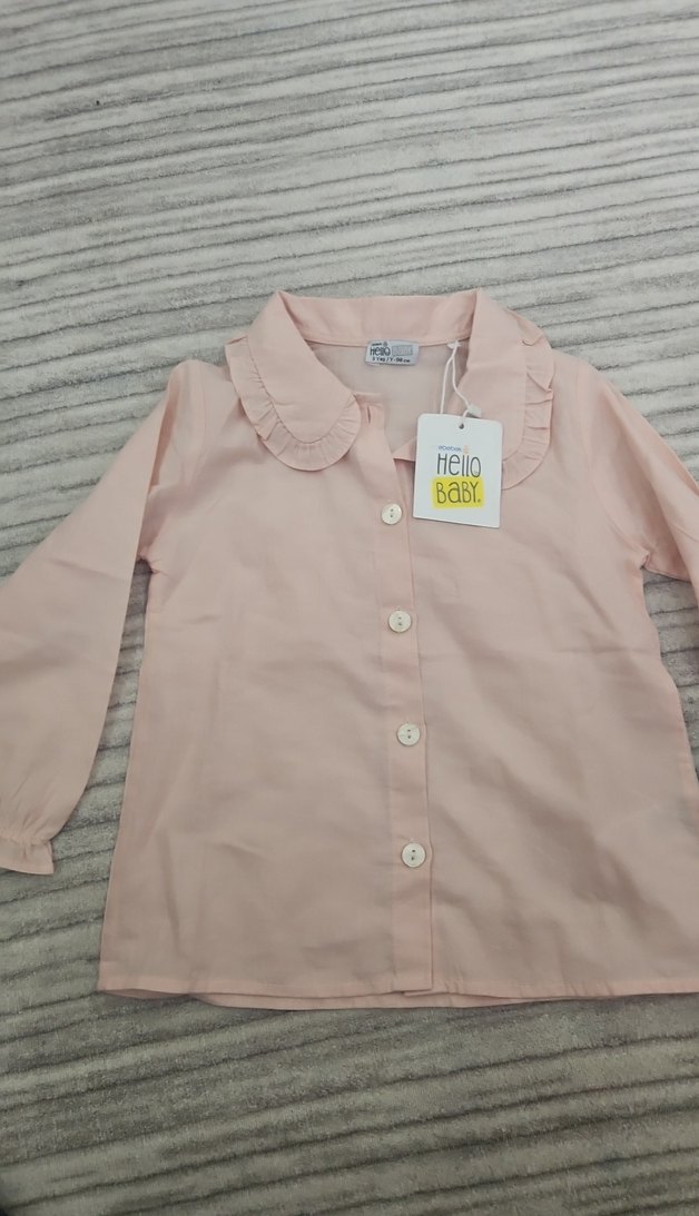 Bol kesim, pembe renkli kız çocuk uzun kollu gömlek. Düğmeli ön kısmı ve yakalı tasarımı vardır. Yumuşak keten kumaştan, "Hello, BaBY." baskılıdır.