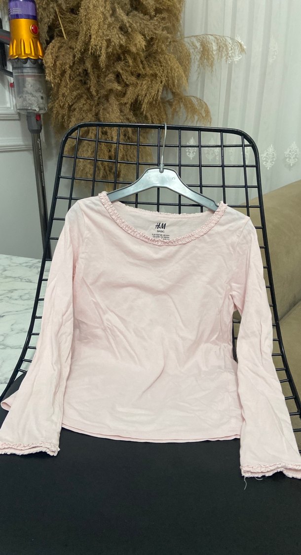 Pembe renkli, keten kumaştan yapılmış kız çocuk uzun kollu bluz, bol kesimi ve yuvarlak yakasıyla sade ve rahat bir şıklık sunar.