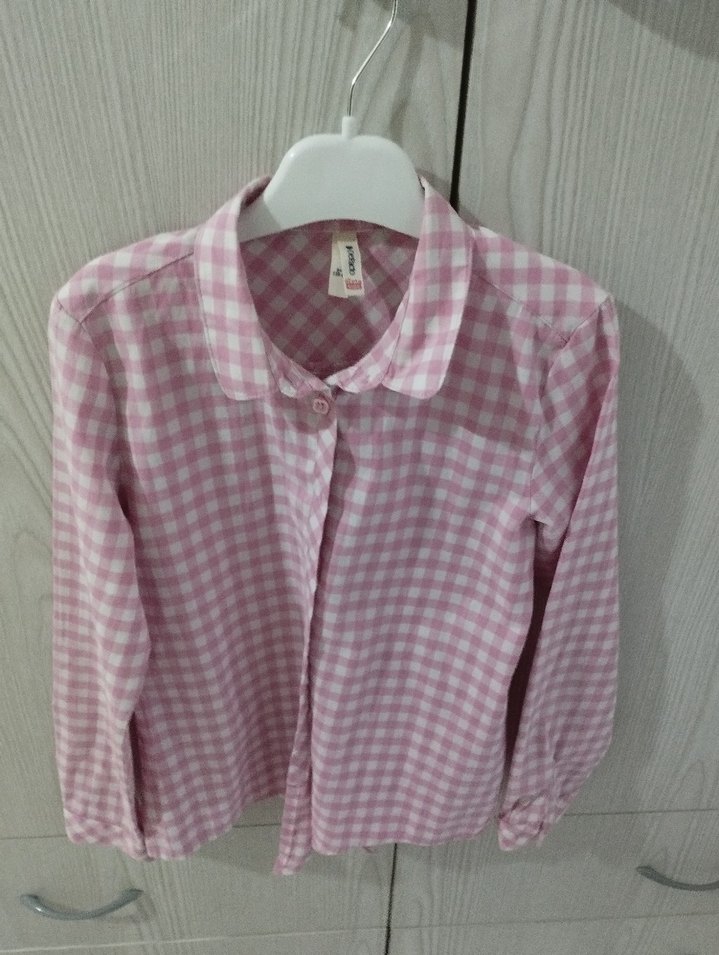 Kız çocuk için pamuklu, uzun kollu, yakalı ve düğmeli, bol kesim pembe kareli gömlek. Sokak stili için uygun.