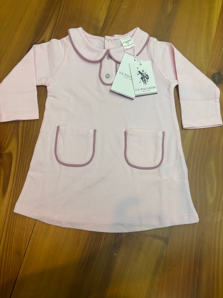 Pastel pembe, uzun kollu, yakalı ve düğmeli kız çocuk elbise. Pamuklu ve rahat kesim, önünde iki cep ve hafif baskı detayı bulunur.