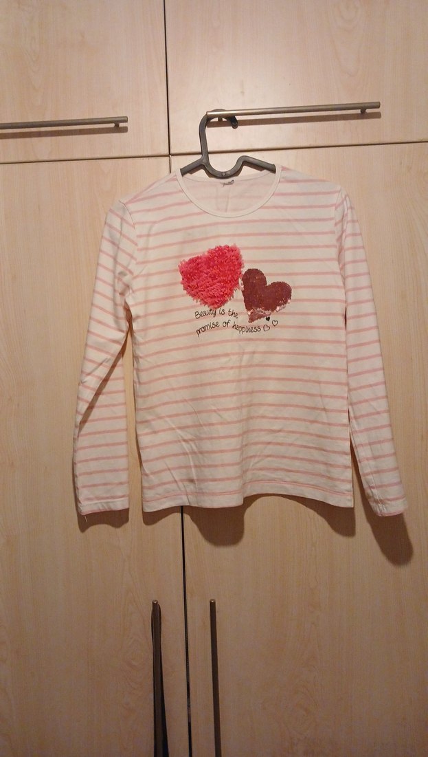 Pamuklu kumaştan, uzun kollu, yuvarlak yakalı kız çocuk tişörtü. Pastel pembe çizgili ve önünde dokulu iki kalp baskısı bulunur. Rahat kesim, günlük sokak stili için uygundur.