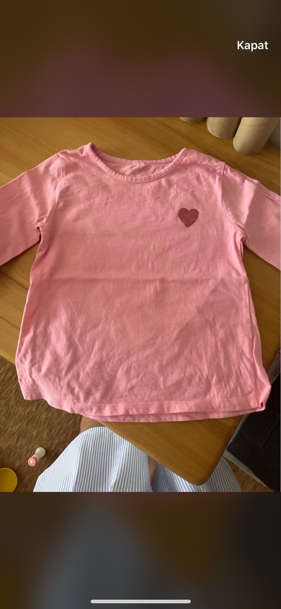 Kız çocukları için, pamuklu kumaştan yapılmış, pembe renkli, uzun kollu ve yuvarlak yakalı, rahat kesim tişört. Küçük kalp detayı bulunur.