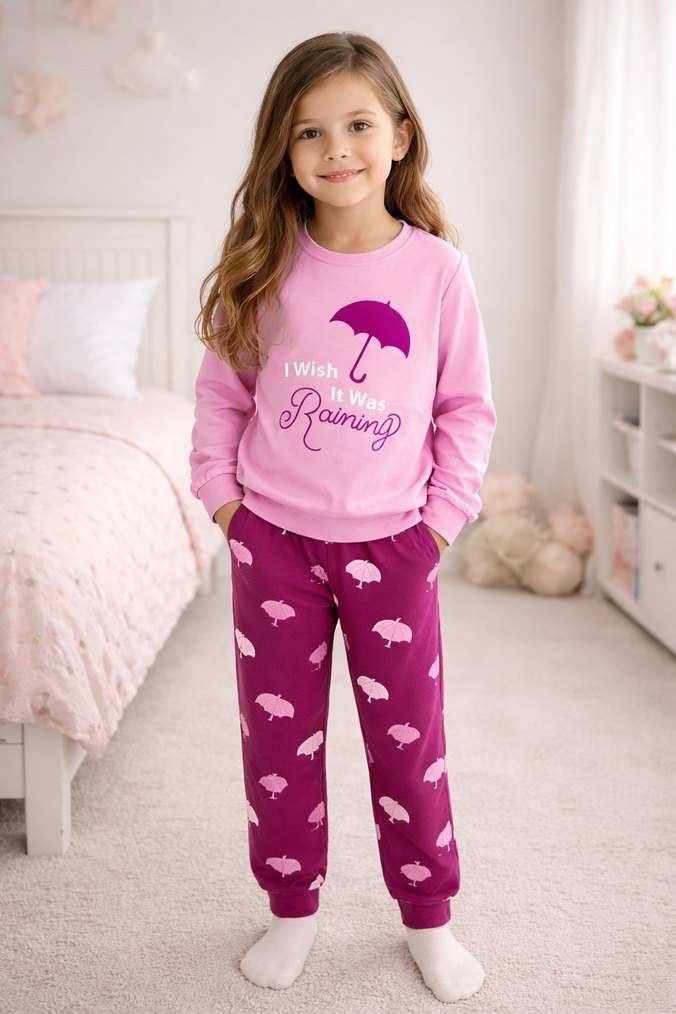 Uzun kollu, pembe polar kumaştan yapılmış pijama takımı, baskılı şemsiye deseni ve örme detaylara sahip. Yuvarlak yaka ve pastel tonlarda. 8 yaş