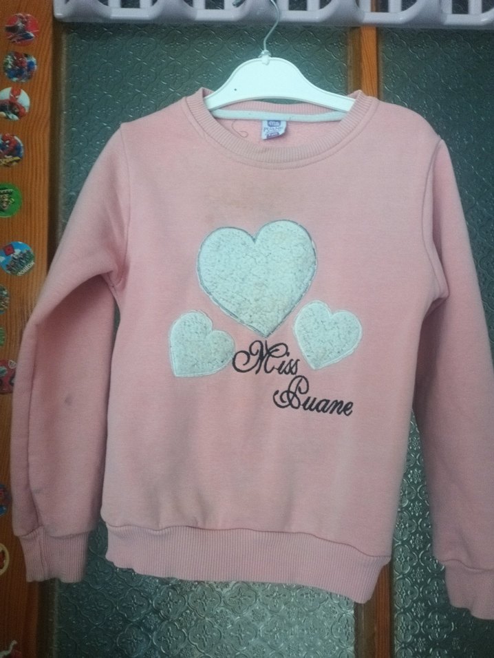Pembe renkli kız çocuk sweatshirt, uzun kollu ve yuvarlak yaka. Yumuşak tüylü kumaştan, örgü dokulu ve bol kesim. Üzerinde üç kalp ve 'Miss Suane' yazısı baskılıdır.