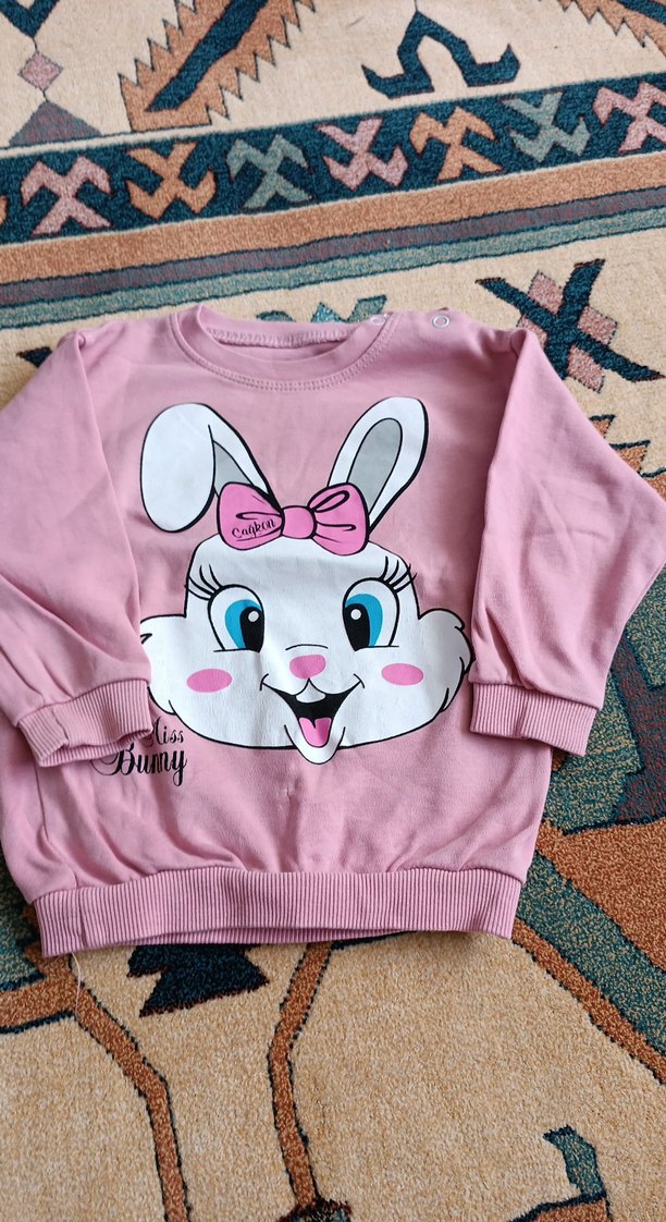 Pembe pamuklu, uzun kollu ve bisiklet yakalı kız çocuk sweatshirtü. Bol kesim, baskılı tavşan figürü ve omuzda düğme detayı bulunur.