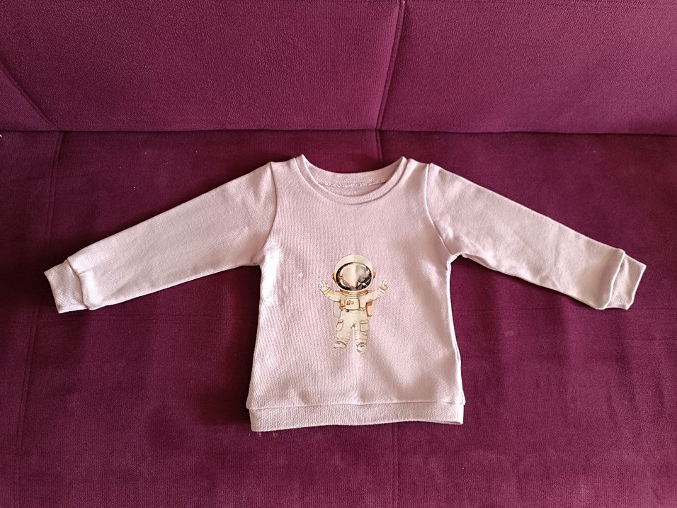 Bol kesim, bisiklet yaka ve uzun kollu kız çocuk sweatshirtü, yumuşak ve sıcak kumaştan. Pastel pembe renkte, astronot baskılı ve örme dokulu.