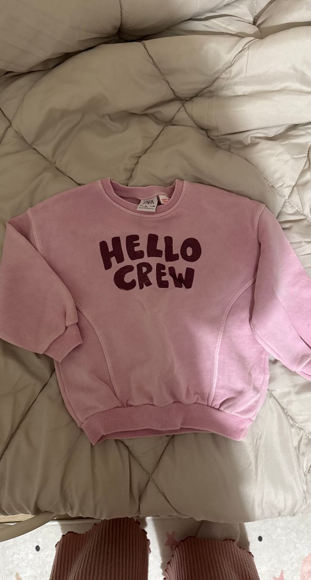 Kız çocukları için pembe renkli, uzun kollu, yuvarlak yaka sweatshirt. Rahat kesimi ve yumuşak, sıcak kumaşıyla dikkat çeker. Önünde 'HELLO CREW' baskısı vardır.