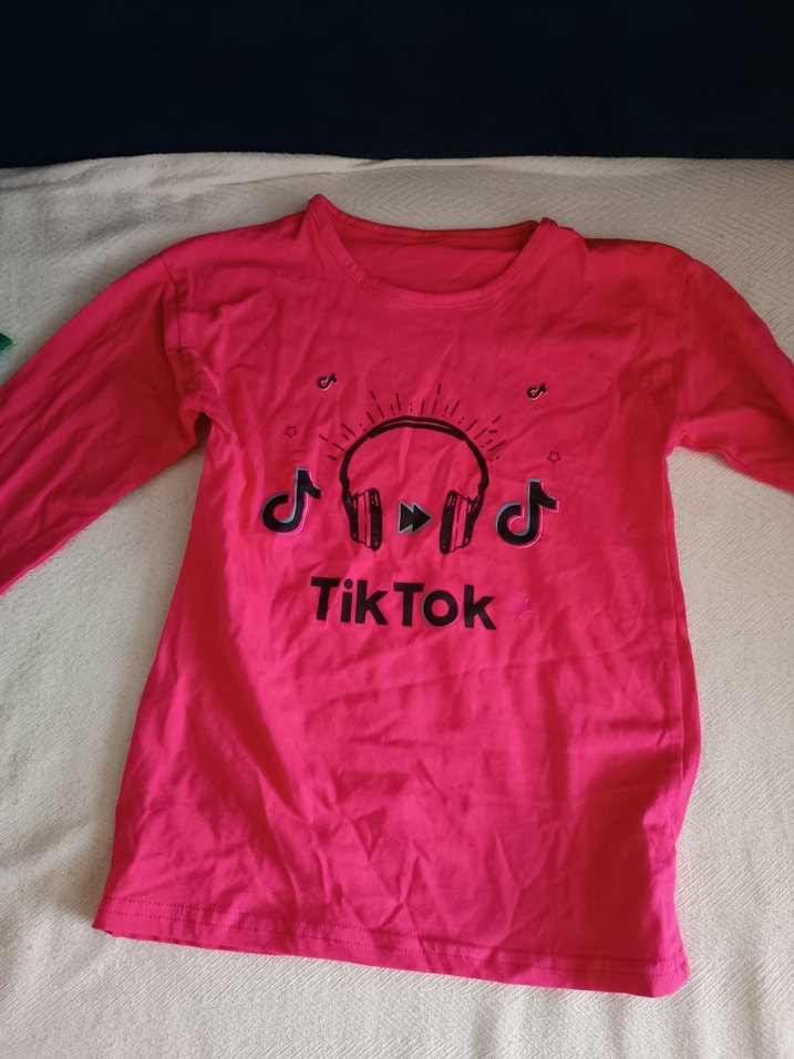 Pembe, uzun kollu, salaş kesim kız tişörtü. Önünde renkli TikTok baskısı ve yuvarlak yaka bulunur. Yumuşak örme sentetik kumaştan üretilmiştir.