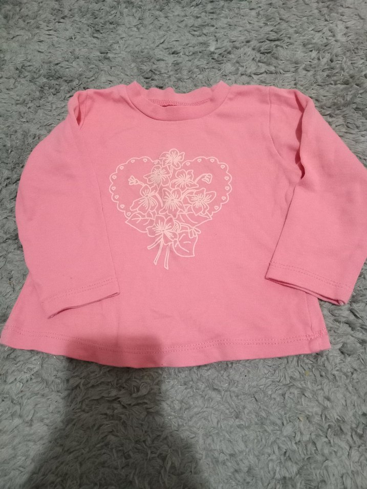Pembe, uzun kollu, yumuşak dokulu kız çocuk tişörtü. Bol kesim, yuvarlak yaka, dantel detaylı ve kalp şeklinde çiçek baskılı.