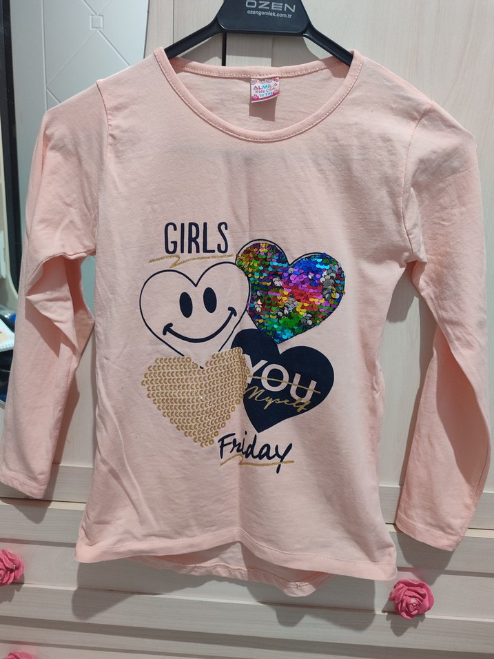 Pamuklu, pembe, uzun kollu kız çocuk tişörtü. Simli baskılı kalpler ve 'Friday, GIRLS' yazılarıyla süslenmiştir. çift taraflı pullu. sayılı kullanıldı. etikette 10 yaş yazıyor ama 9 yaş daha uygun gibi